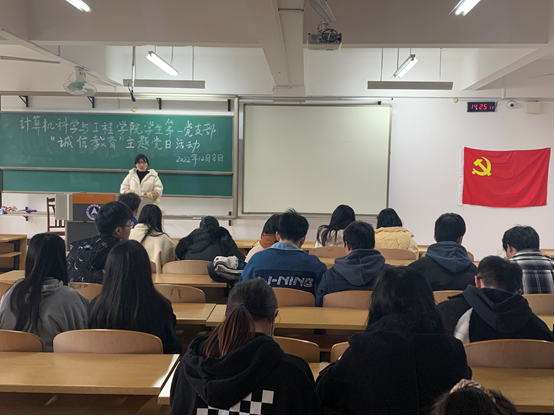 带头营造廉洁之风,党支部先行。自9月起,我院党委下设各支部用丰富多彩的形式,开展了清风进校园,廉洁伴我行系列党日活动。我院学生第一、第二党支部结合诚信教育,在飞天217开展了“诚信教育”主题党日活动。活动中,学生支部书记带领党员开展讨论,就大学生党员如何在考试中发挥先锋模范带头作用,维护考场正气,严肃考场纪律的问题进行讨论,畅所欲言。最后,结合诚信考试承诺书,给全体党员同志提出四点希望和要求,一是高度重视期末考试诚信应考工作,切实以身作则,发挥先锋模范带头作用,;二是认真复习每一门功课,充分利用个人时间,认真复习,满怀信心地迎接考试;三是尊重每一位监考老师,严格遵守考试、考场规则,杜绝考试作弊行为,做诚实守信的学生。四是树立与不良风气做斗争的勇气和决心,敢于检举和揭发考试作弊行为。最后,支部全体党员进行诚信考试宣誓,签署考试诚信承诺书。