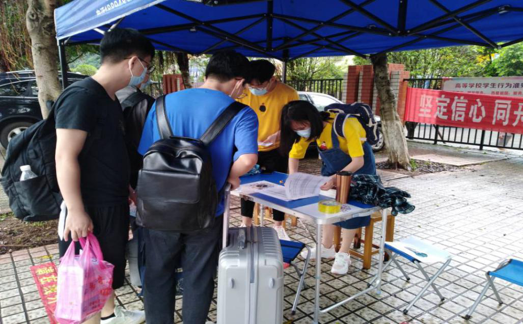 为确保学生能够安全进入校园学习生活,党员志愿者严格按照“错峰错时、分批分流”的原则,严格执行“一测体温,二行李消毒,三核验身份,四通过进校”的返校流程,虽然流程繁琐、天气炎热,但党员志愿者们仍然以热情饱满迎接返校学生,返校学生们也积极配合学校防疫工作,按要求履行入校检查程序。