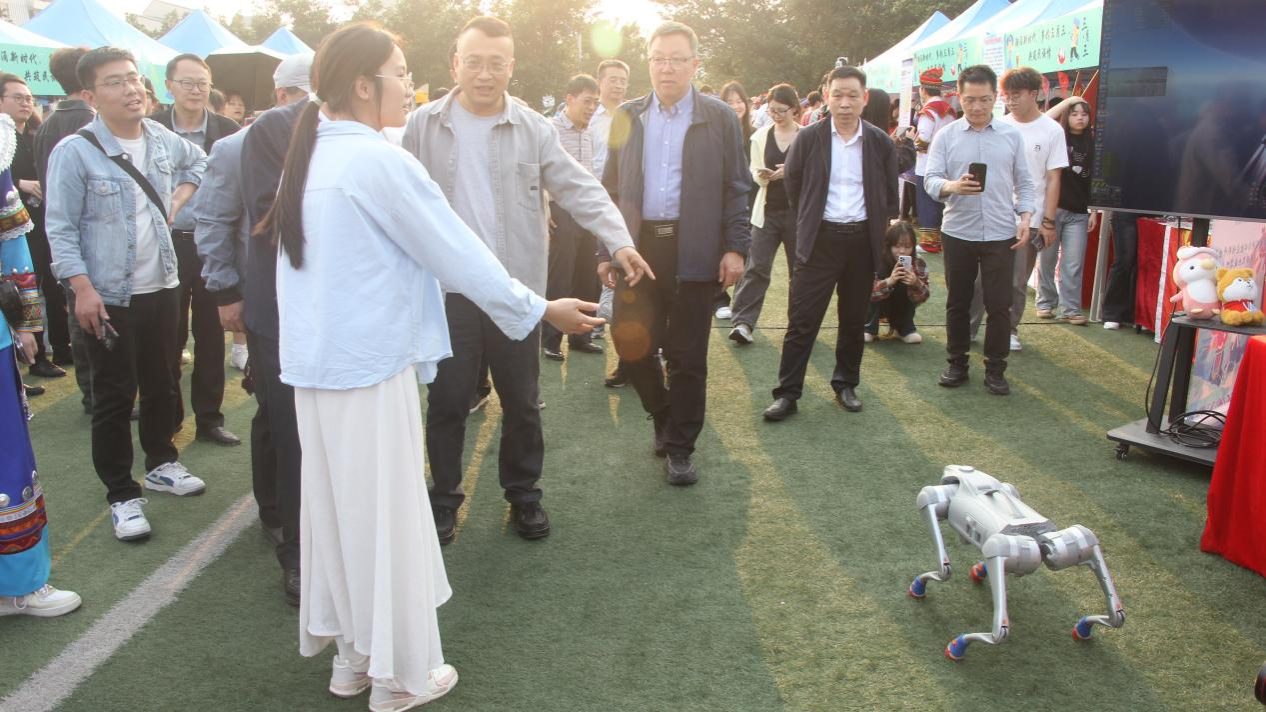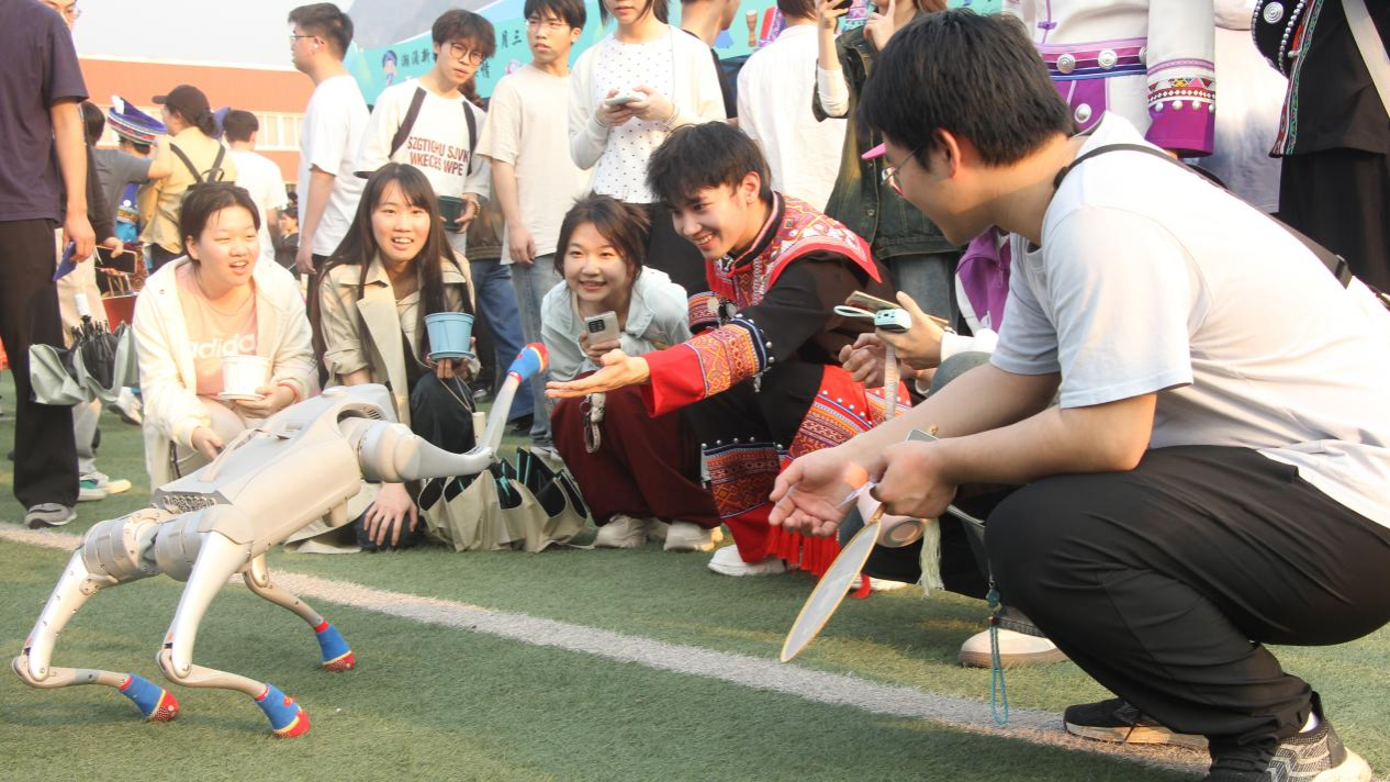 由我院与校外合作自主联合研发的四足机器狗"笨笨"与自主开发的智能AI交互机器人"小航"的默契组合成为全场焦点。搭载多模态感知系统的"笨笨"通过激光雷达实现自主导航,在师生簇拥中完成舞蹈的精准复现;"小航"则以自然语言处理技术为支撑,以生动语言讲述"三月三"的起源发展与文化内涵。这对科技搭档的灵动演绎,既展示了智能机器人领域的技术突破,更构建起传统文化传播的数字化新范式。