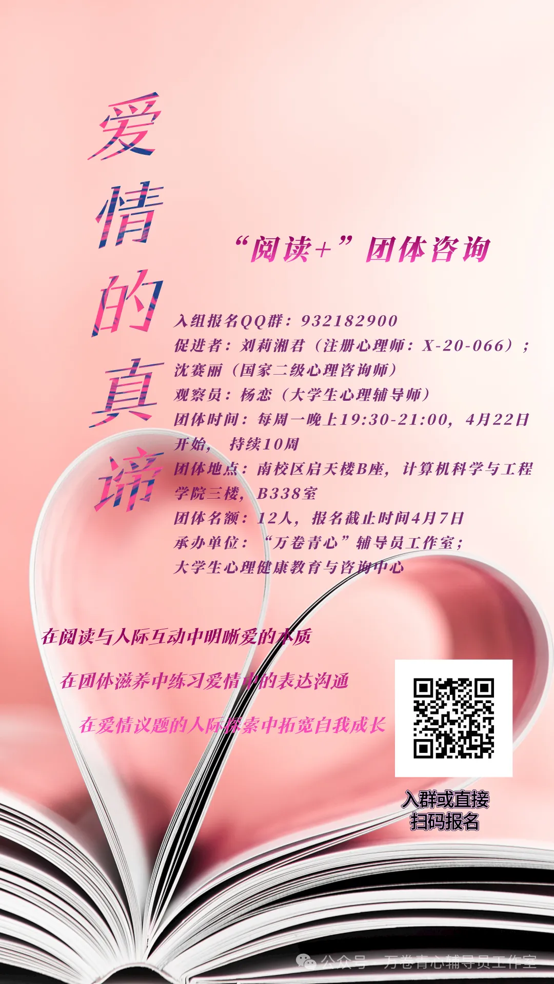 我们邀请你来到“爱情的真谛——阅读+团体咨询“的人际团体中,为自己和爱人补上一堂至关重要的“爱情课”,在团体咨询模式中,大学生朋友们可以通过大量可以付诸实践的讨论与练习,在团体咨询这个安全温暖的人际容器中,通过刻意练习,提高爱的能力。