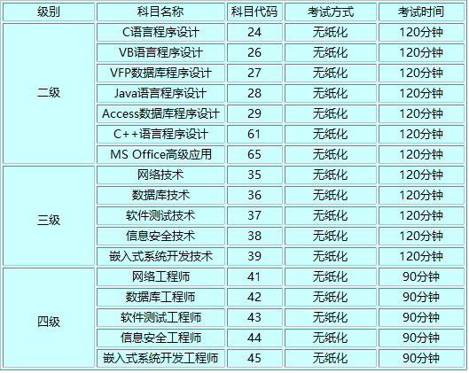 二、考试科目: 2017年下半年全国计算机等级考试开考科目(2013版考试大纲)